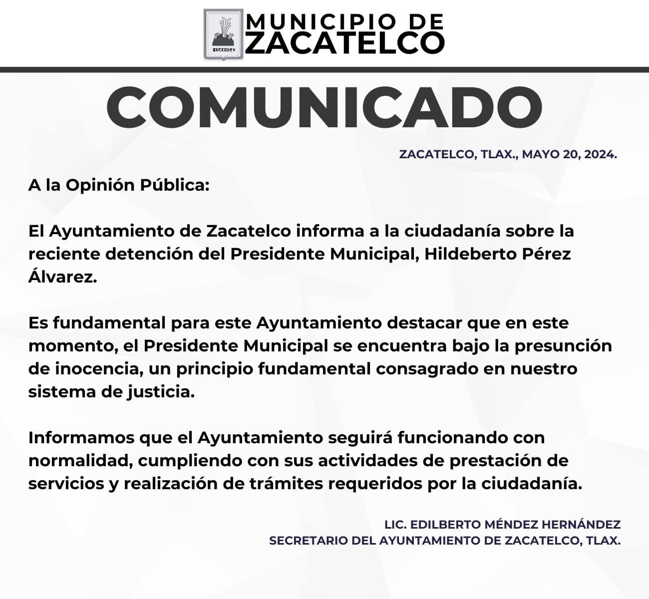 Tlaxcala, Tlax, a 20 de mayo de 2024/JL Hertewing/ El gobierno municipal de Zacatelco, a través de un comunicado dirigido por el Secretario del Ayuntamiento Lic. Edilberto Méndez Hernández a la ciudadanía, dio a conocer de la detención del presidente municipal Hildeberto Pérez Álvarez, donde señalo que las diferentes áreas de este Ayuntamiento siguen funcionando con normalidad, cumpliendo con sus actividades de prestación de servicios y realización de trámites requeridos por la población.