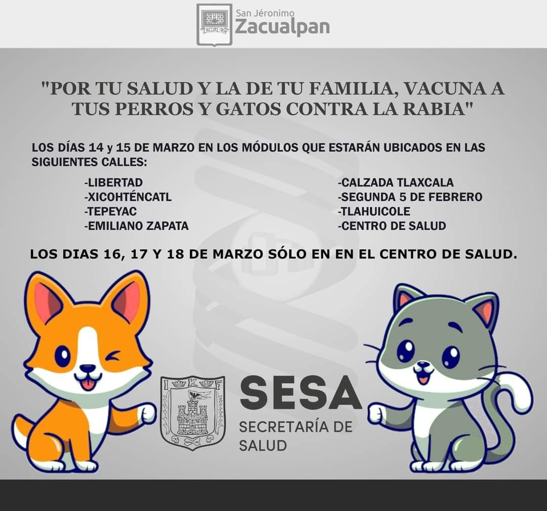 Tlaxcala, Tlax, a 12 de marzo de 2024/Redacción/ La Secretaria de Salud SESA, llevará a cabo del 14 al 18 de marzo del presente año la vacunación antirrábica para peros y gatos, donde el responsable de dicha campaña dijo no bajemos la guardia, mantengamos a Tlaxcala y a Zacualpan sin casos de rabia, vacunar a tus mascotas a partir del primer mes de edad, revacunarlos a los 3 meses y posteriormente cada año durante toda su vida.